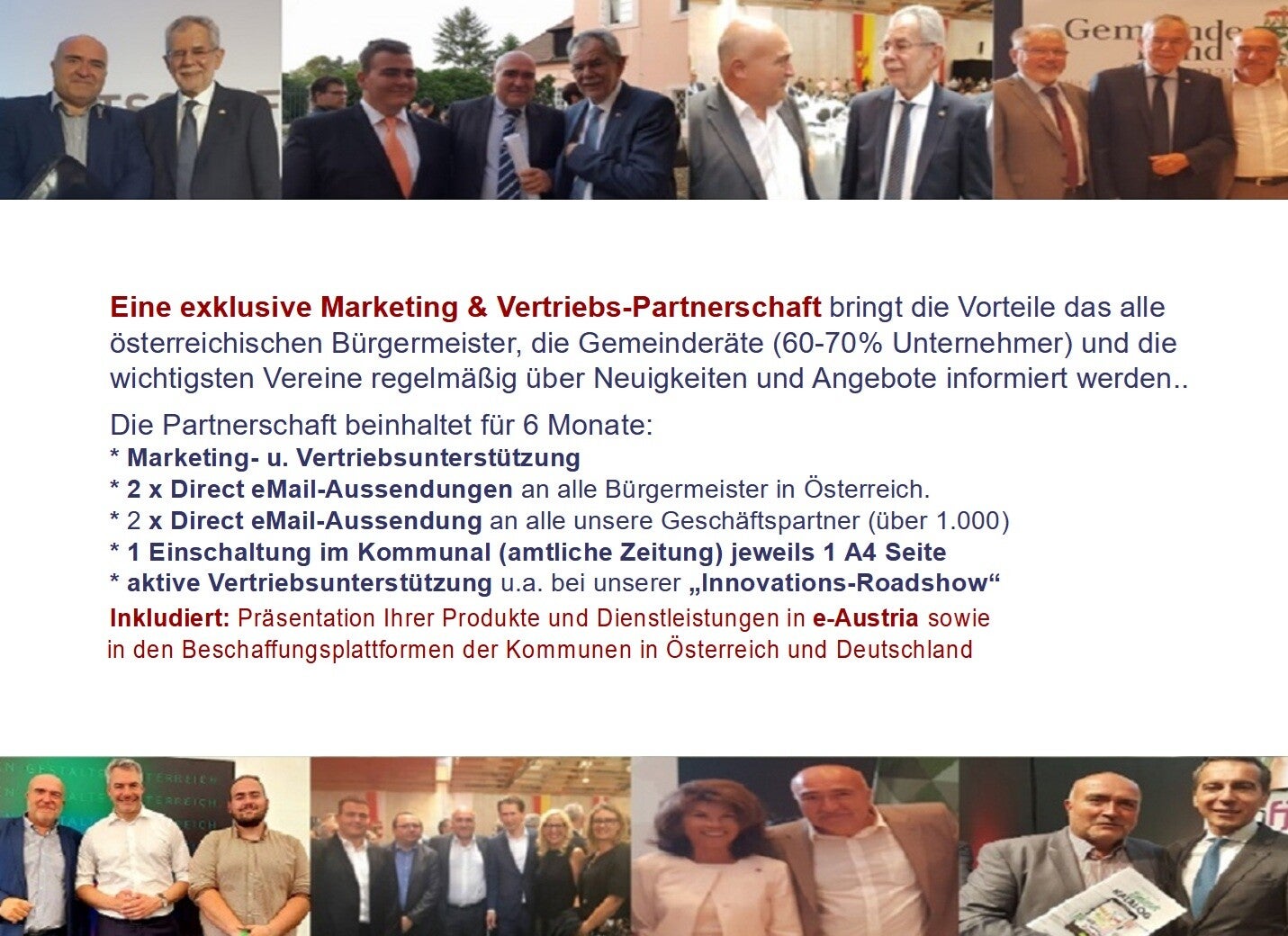 Eine exklusive Marketing & Vertriebs-Partnerschaft bringt die Vorteile das alle österreichischen Bürgermeister, die Gemeinderäte (60-70% Unternehmer) und die