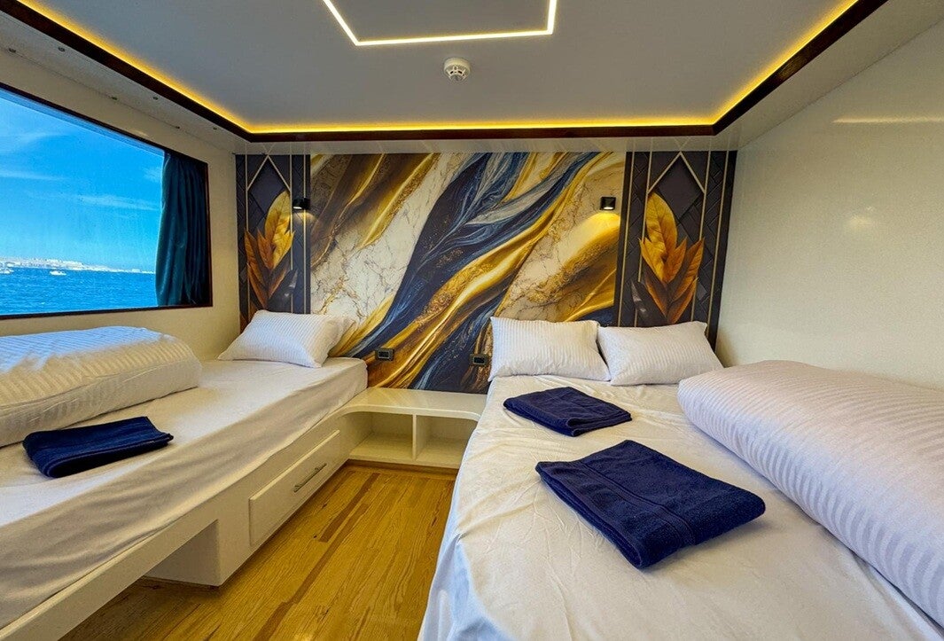 *3 Decks - *8 Kabinen mit je 2 Betten - *2 Royal Suiten - *Restaurant + Küche - *Alle Navigationsgeräte - *2 Daewoo-Motoren mit je 1000 PS - *2 Generatoren mit je 100 Kilowatt - *2 Entsalzungsanlagen mit je 8 Tonnen Kapazität - *Zentrale Klimaanlage